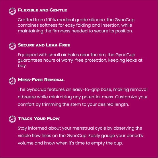 "I love the GynoCup menstrual cup! It's comfortable, easy to use, and I appreciate the fact that it's reusable, reducing waste."